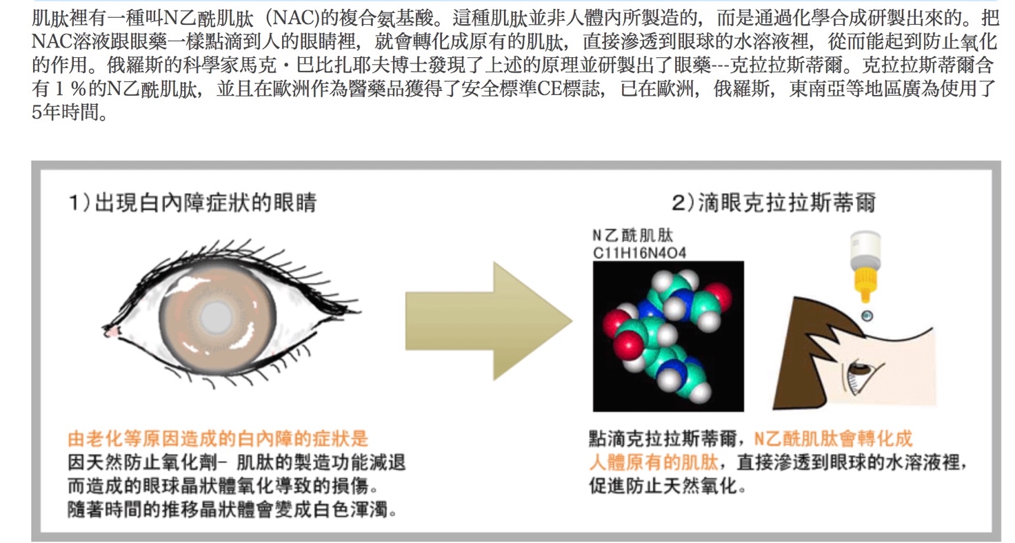 現在在中國實用的治療藥物只能減緩發展速度不能徹底根治白內障。但是最近俄羅斯科學家發明的對白內障有效果的N乙酰肌肽眼藥水克拉拉斯蒂爾在歐洲受歡迎。