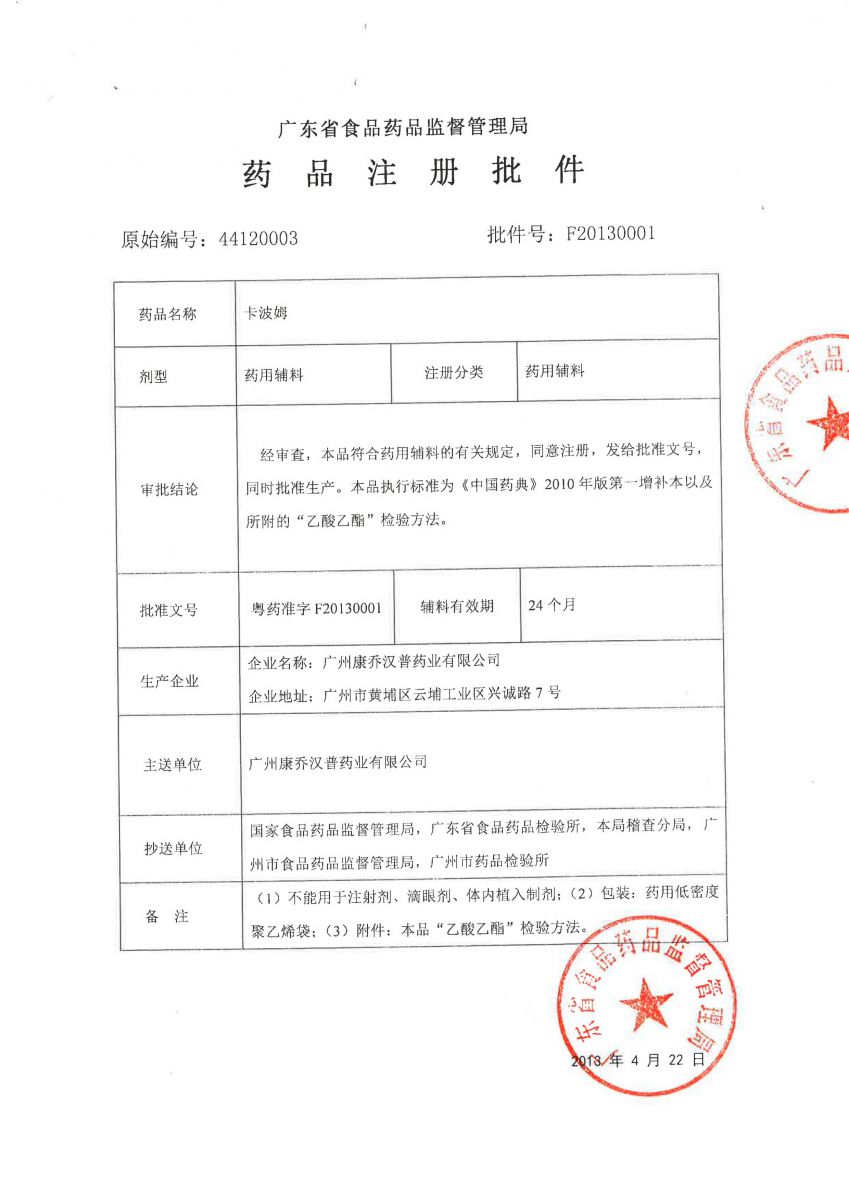 產品應用:藥用輔料,局部給藥系統.凝膠.膏霜.凝膠劑、乳劑、混懸劑 (廣州康喬漢普藥業,粵藥準字:F20130001)
